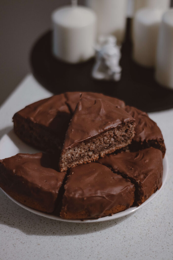 Až budete chtít koláč podávat, rozpusťte zbývající čokoládu (stejným způsobem jako výše) a každý kousek podávejte s jogurtem a trochou rozpuštěné čokolády.